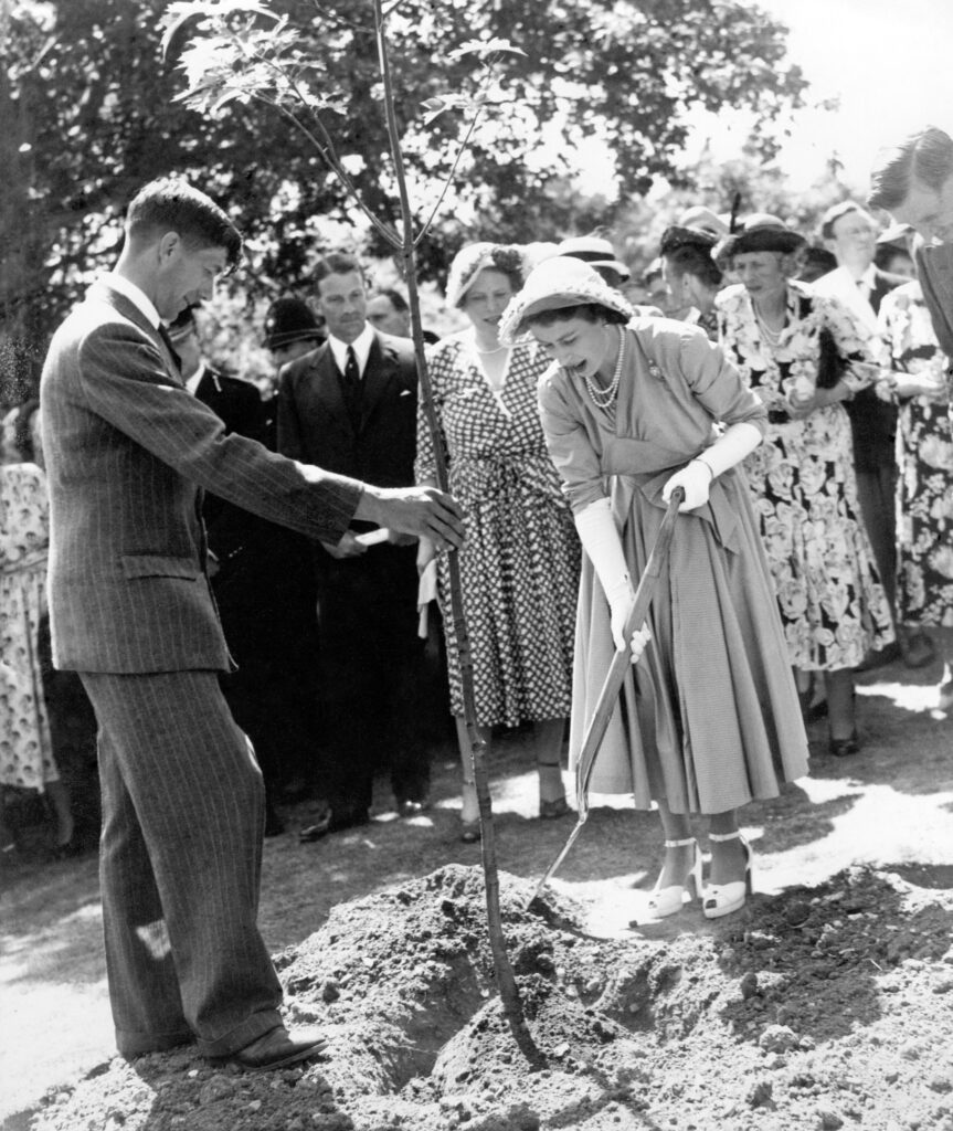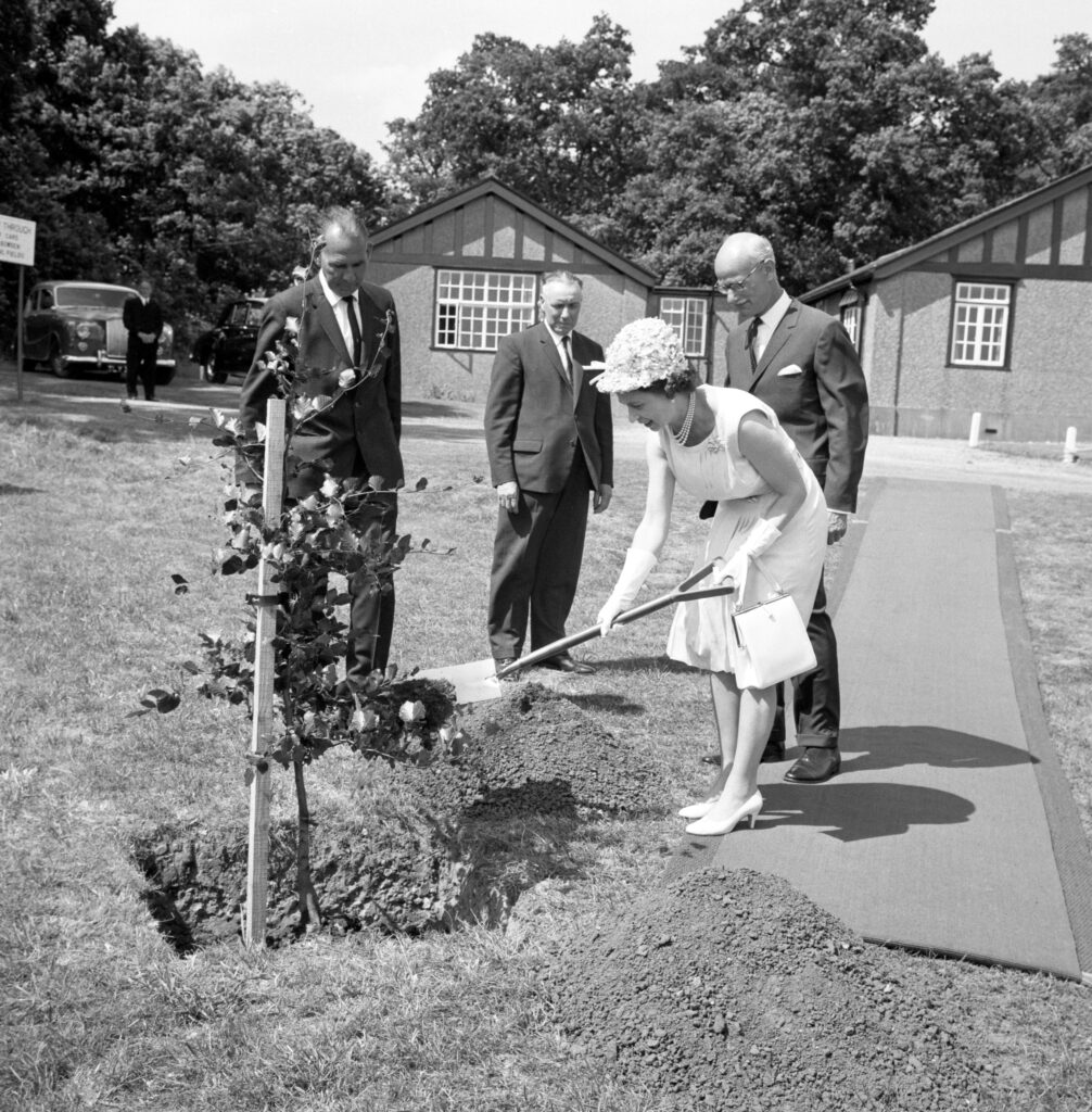 Princess Elizabeth plants a tree to celebrate the opening of a youth holiday centre. Around 800 school children gathered to greet her upon arrival.